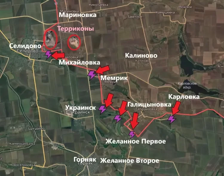 Тем не менее, на Селидовском участке продолжается быстрое продвижение ВС РФ, но чуть восточнее. Наши бойцы взяли под контроль населённый пункт Галицыновка и уже продвинулись дальше на юг - в сторону Желанного Первого и Желанного Второго. Помимо этого, на юго-западе от Мемрика продолжаются бои близ Украинска. От недавно освобождённой Карловки подразделения Армии России продвигаются на юго-запад.