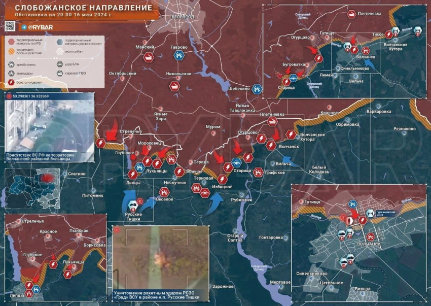 На Харьковском направлении в Волчанске армия России продвигается из северной части города. Днем появились данные, что под наш контроль перешла больница, а также, что наши войска штурмуют завод – это два основных укрепрайона в северной половине. В южной части города ВСУ в авральном режиме стараются установить минные заграждения. Активна наша авиация и артиллерия, осложняет этот процесс. Бои тяжелые, ВСУ постоянно тянут резервы. Идут бои и в окрестностях Липцов, надеемся на подтверждение информации, что наши войска вышли на окраины села.