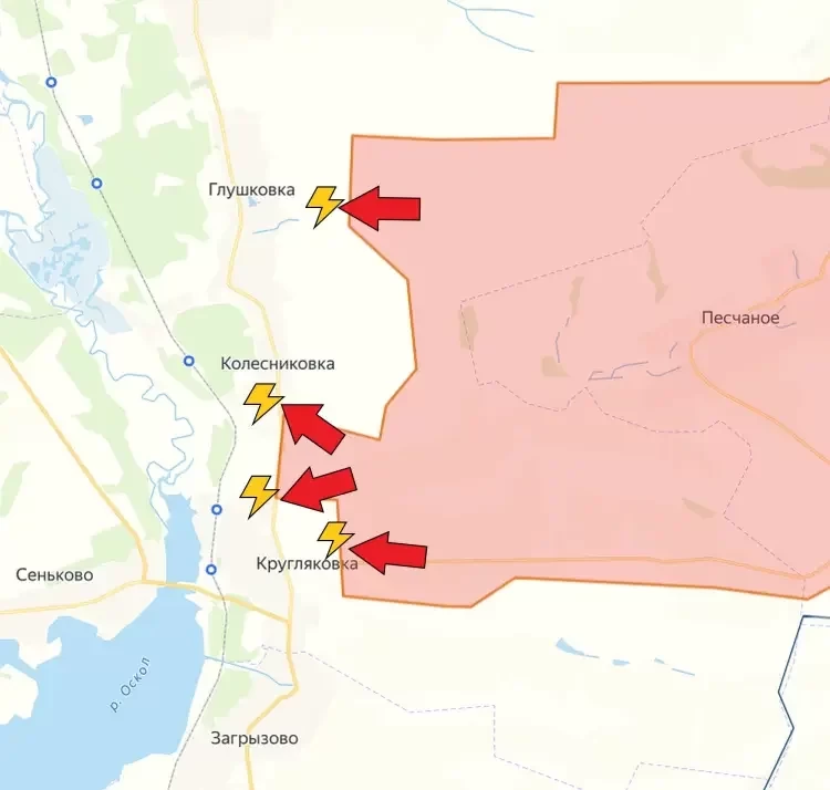 На Купянском направлении продолжаются бои на подступах к Глушковке, а также в Колесниковке и Кругляковке. Наши бойцы постепенно продвигаются к реке Оскол и близки к перерезанию одного из путей снабжения (через Сеньково) группировки ВСУ, располагающейся южнее.
