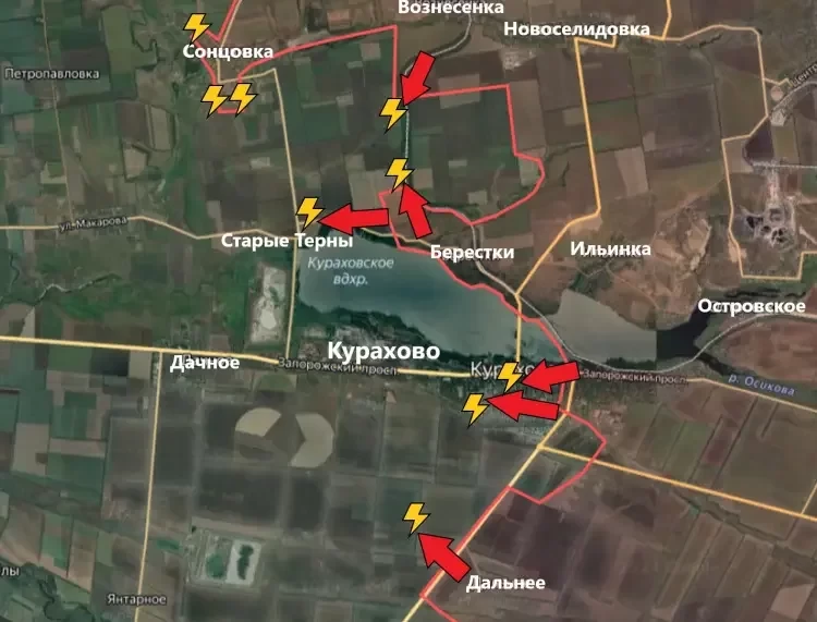 Западнее Берестков российские войска имеют тактические успехи, продвинулись севернее Кураховского водохранилища в направлении Старые Терны.