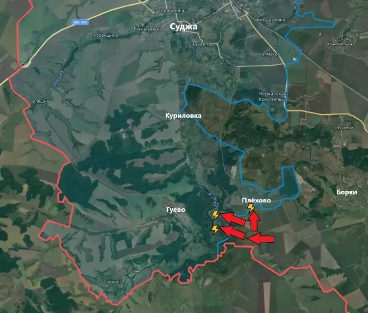 В свою очередь Telegram-канал PulsePen пишет о том, что на юго-восточном участке подразделения ВС РФ продвинулись южнее Плёхово и зачистили территорию до реки Псёл. Также сообщается о боях в самом Плёхово. Ряд источников сообщает, что населённый пункт был освобождён Армией России, другие же утверждают, что бои всё ещё продолжаются и не нужно торопить события. Ждём сегодня хороших новостей с подтверждением.
