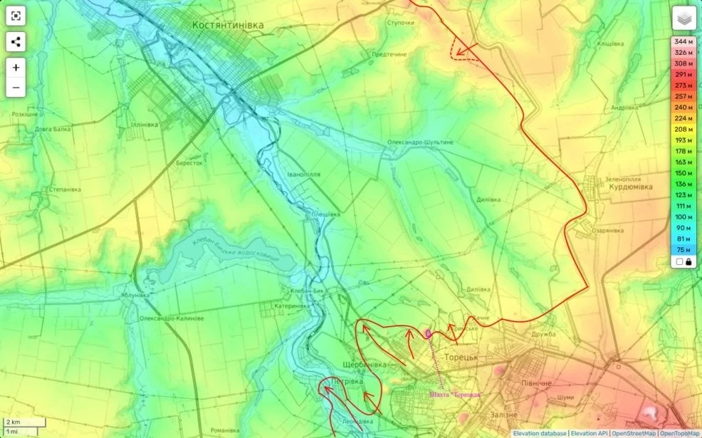 Вчера наши части атаковали в н.п. Крымское. Это обход шахты «Торецкая» с запада. Полное занятие Крымского упростит нам далее и полное занятие этого последнего узла обороны ВСУ на севере Торецкой агломерации.