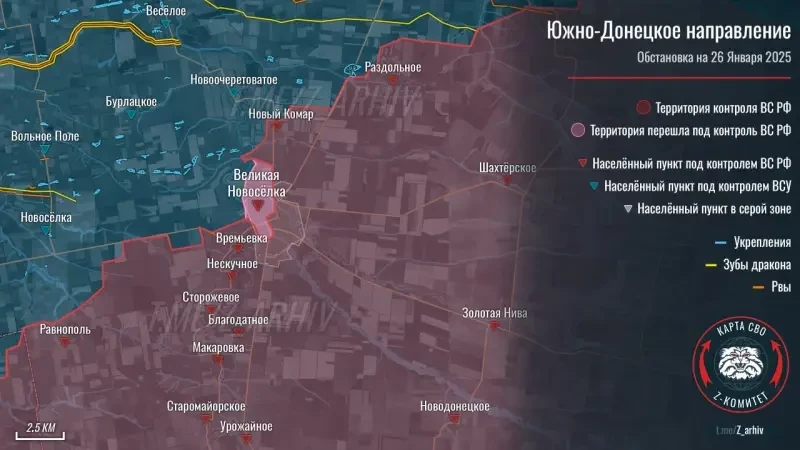 Взятие под контроль российскими войсками Великой Новоселки на бывшем Времевском выступе является грандиозным успехом не только группировки «Восток», но и всех ВС России. Вчера, 26 января 2025 года, бывший Времевский выступ, где ВСУ в рамках летнего контрнаступления пытались прорваться к Мариуполю, перестал существовать. Для этого штурмовым подразделениям группировки «Восток» понадобилось восемь месяцев. Начав освобождение со Старомайорского 10 июня 2024 года, бойцы 13 июля освободили Урожайное и после длительного перерыва, уже в декабре, приступили к дальнейшему продвижению. 5 декабря было освобождено Благодатное, 22 декабря — Сторожевое, а затем 13 января 2025 года — Нескучное, 17 января — Времевка и 26 января — Великая Новоселка.