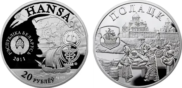 В 2011 году Национальный банк Республики Беларусь выпустил серебряную памятную монету «Полоцк. Ганзейский союз». В 1210 году в Полоцке был основан Немецкий двор, а в 1229 году город вошел в состав Ганзейского союза. Через Полоцк шли торговые пути в Орду — он был крупнейшим транзитным городом для ганзейских товаров, поставляемых на Восток, а его основным экспортным товаром был лес и полоцкий мед, который в те времена был почти что единственной сладостью для небогатых жителей Европы. Полоцк принимал участие и в торговых войнах — он к началу XV века полностью перекрыл доступ северогерманских купцов к рынкам Витебска и Смоленска, вынуждая их продавать свои товары в Полоцке только оптом, после чего эти товары уже шли на Восток под «крышей» полоцких купцов. А в июне 2009 года Полоцк стал членом Нового Ганзейского союза. Художник: Доброхна Сураевска (Польша).