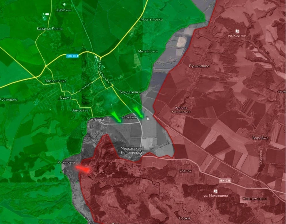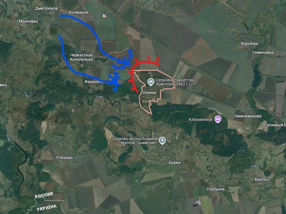 Российская армия продолжает ликвидировать последствия наступления ВСУ в направлении села Уланок. Хотя на земле своей цели противник не достиг, зато в плане пропаганды вполне преуспел: западные СМИ сообщили о прорыве ВСУ на 5 км вглубь российской территории и взятии хутора Колмаков и деревни Фанасеевка. Сейчас остатки сил ВСУ фиксируются в лесополосах под Уланком (около 8 человек), у Черкасской Конопельки и в лесу к востоку от Фанасеевки в урочище Соломатино. Российские отряды стараются выбить их с помощью дронов и артиллерии.