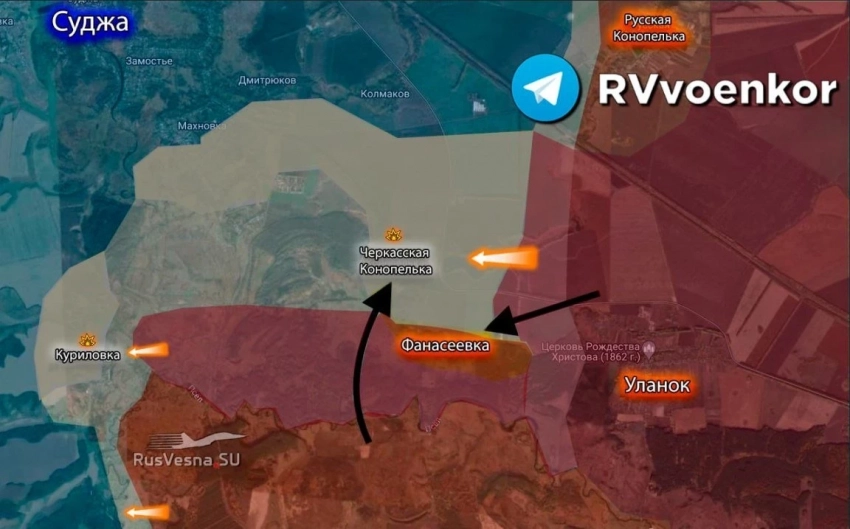 В свою очередь Telegram-канал "Русская Весна" пишет о том, что в течение суток группировка войск "Север" продолжила активные наступательные действия в районе Фанасеевки и Черкасской Конопельки, где с 6-го февраля остаются остатки подразделений ВСУ, пытавшиеся к прорваться к н.п. Уланок.