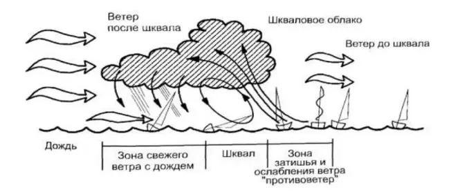 Устроители регаты могли заранее узнать прогноз на усиление ветра, но или не узнали, или как всегда... Внешних признаков приближения шквала почти не было. Только жара, затишье и своего рода дуга из дымки, этакая вертикальная стенка на высоте в несколько сотен метров и длиной в пару километров, которая заметно быстро приближается. Первый раз я просто обратил внимание на необычное явление, а когда эта дуга приблизилась, поднялся сильный ветер с порывами где-то под 15-18 м/с. Поднимало в воздух листы оцинковки, одним из которых сильно поранило знакомого. На следующее лето я снова увидел в небе похожую дугу из дымки, и всё повторилось, правда, немного слабее. (Новожилов Н.И. «Ветер побережья», журнал «Катера и яхты» №55, 1975 год).
