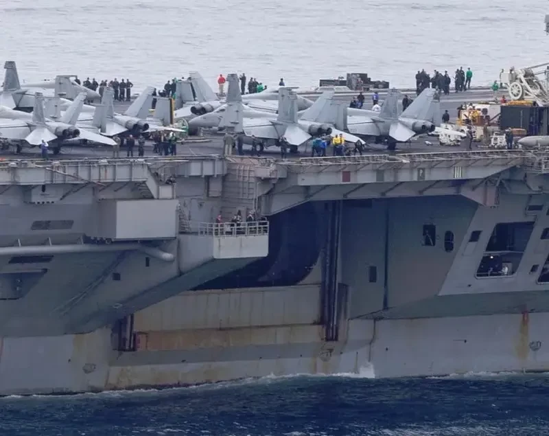 На фотоснимке видны многочисленные крупные пробоины в спонсоне (выступающий участок верхней палубы) по правому борту в кормовой части корабля рядом с одним из авиационных подъёмников за «островом». При этом неизвестно, имеются ли повреждения в других частях авианосца.