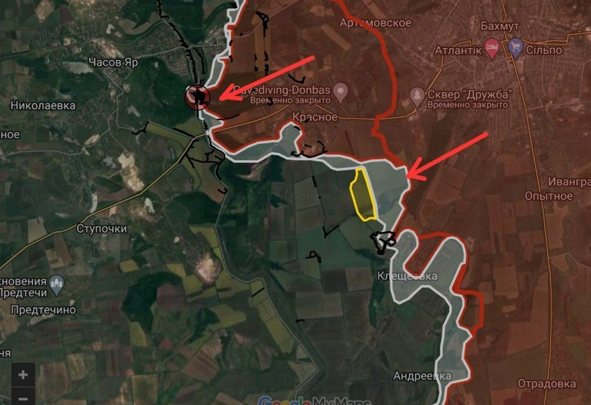 На ЧасовЯрском - в районе между Ивановским и Богдановкой через лес (заказник Ступки-Голубовские-2) ВС РФ перешли канал Северский Донец-Донбасс. Бои идут на окраинах микрорайона «Новый». Продвижение российских войск на участке шириной до 900 метров на глубину до 700 метров.