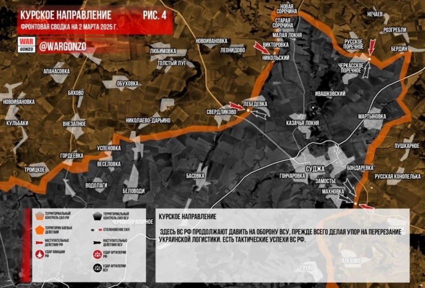 ВС РФ продвинулись восточнее Николаево-Дарьино в Курской области: карта боевых действий по состоянию на 2 марта 2025 года
