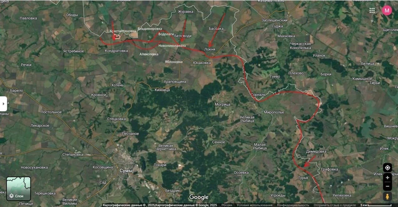"Очевидно, что задача наших войск здесь выйти на линию Хотень - Юнаковка, а также занять высоты севернее этой линии, чтобы с них уже дальше атаковать Сумы. Отсюда уже дронами можно атаковать всю территорию Сум. Также сюда можно подтянуть артиллерию и отстреливать до половины территории города. Если нашим войскам это удастся, то это будет серьёзная заявка на занятие областного центра Сумской области, которое, я надеюсь, произойдёт в рамках летней кампании", - сообщил Подоляка в своём Telegram-канале.