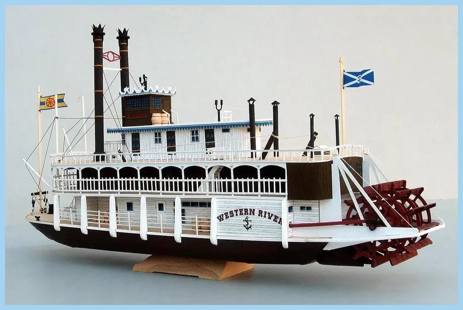 Итак, корпус. Он плоскодонный, с заметной погибелью палубы. Нижняя верхняя палуба обычно шире самого корпуса, по крайней мере, в его носовой части, хотя и не у всех пароходов такое наблюдалось. Высота борта и осадка совсем небольшая, так что плавать такие пароходы могли буквально «по росе». Получается, что изготовление такого корпуса особого мастерства не требовало. Материал использовался самый разный – и дерево, и металл (на более поздних пароходах). По сути дела, корпус «парохода Тома Сойера» представлял собой самый настоящий… понтон, на который устанавливались и все надстройки, и всё его оборудование.