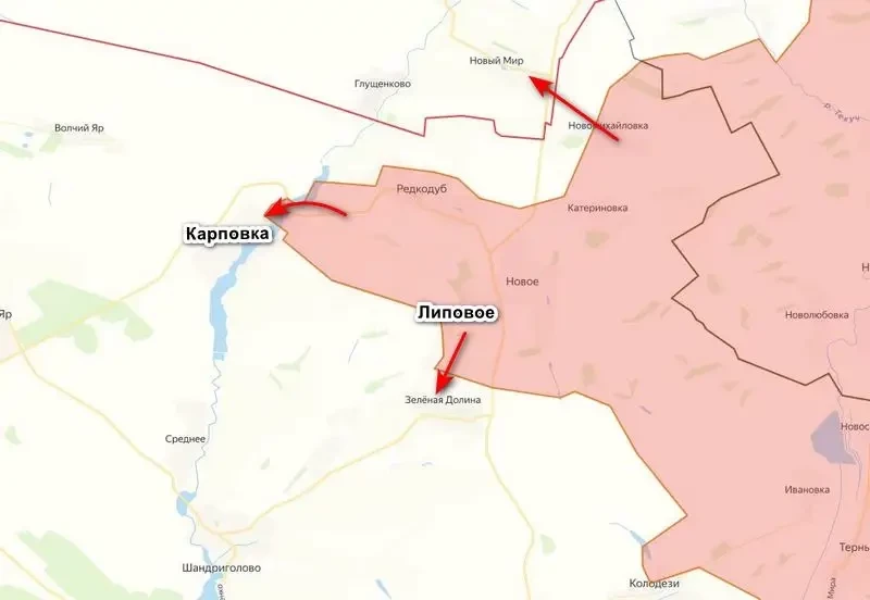 Штурмовые подразделения группировки войск «Запад» сумели войти и закрепиться в селе Карповка к западу от Редкодуба. Согласно данным на сегодняшний день, наши ведут бои за овладение данным населенным пунктом, тогда как противник предпринимает попытки выбить закрепившихся в селе российских штурмовиков. К самой Карповке подразделения ВС РФ вышли в воскресенье, сумев с ходу зацепиться за северные окраины.