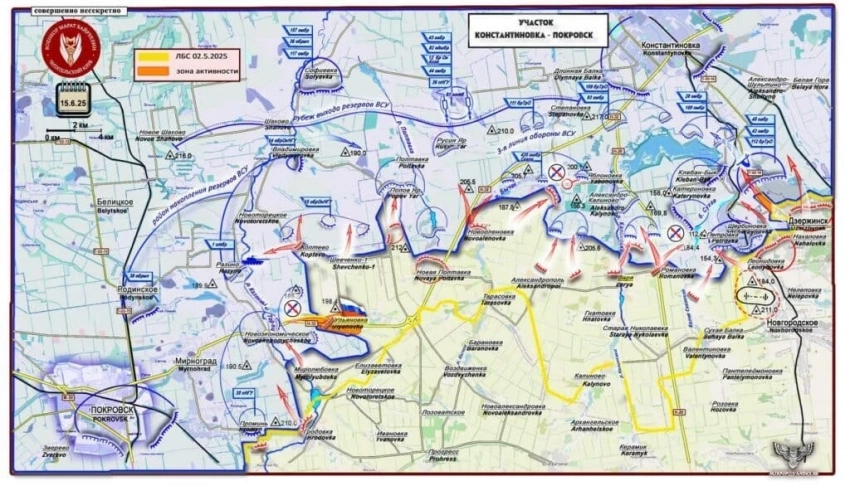 На Константиновском направлении российские войска расширили контроль территории западнее Курдюмовки, давят восточнее Дылеевки и в районе Озаряновки, продолжаются встречные бои. ВС РФ ведут штурмовые действия севернее Торецка в направлении восточной окраины Клебан-Быкского водохранилища и в районе Нелеповки. Продолжаются встречные бои на южной окраине Александро-Калиново и в Яблоневке.