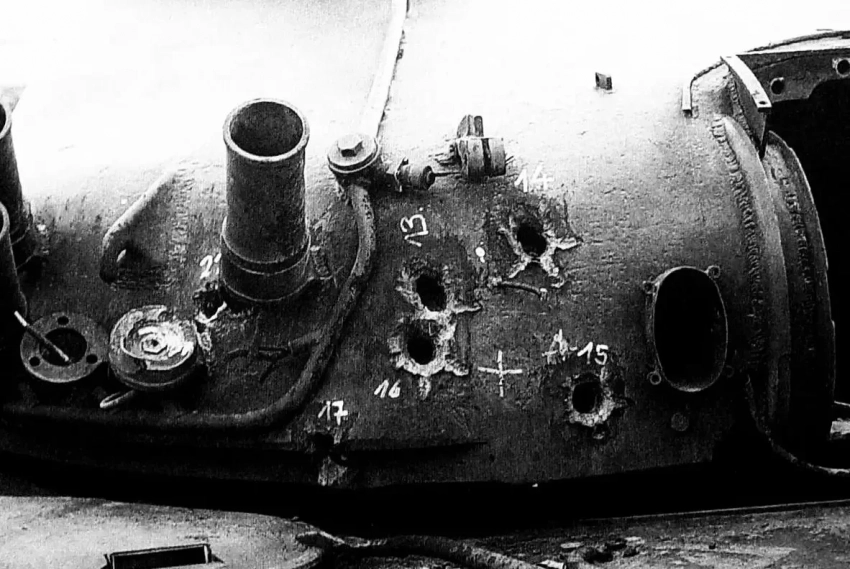 Пробоины в броне башни танка с характерными для ОБПС лепестками по краям