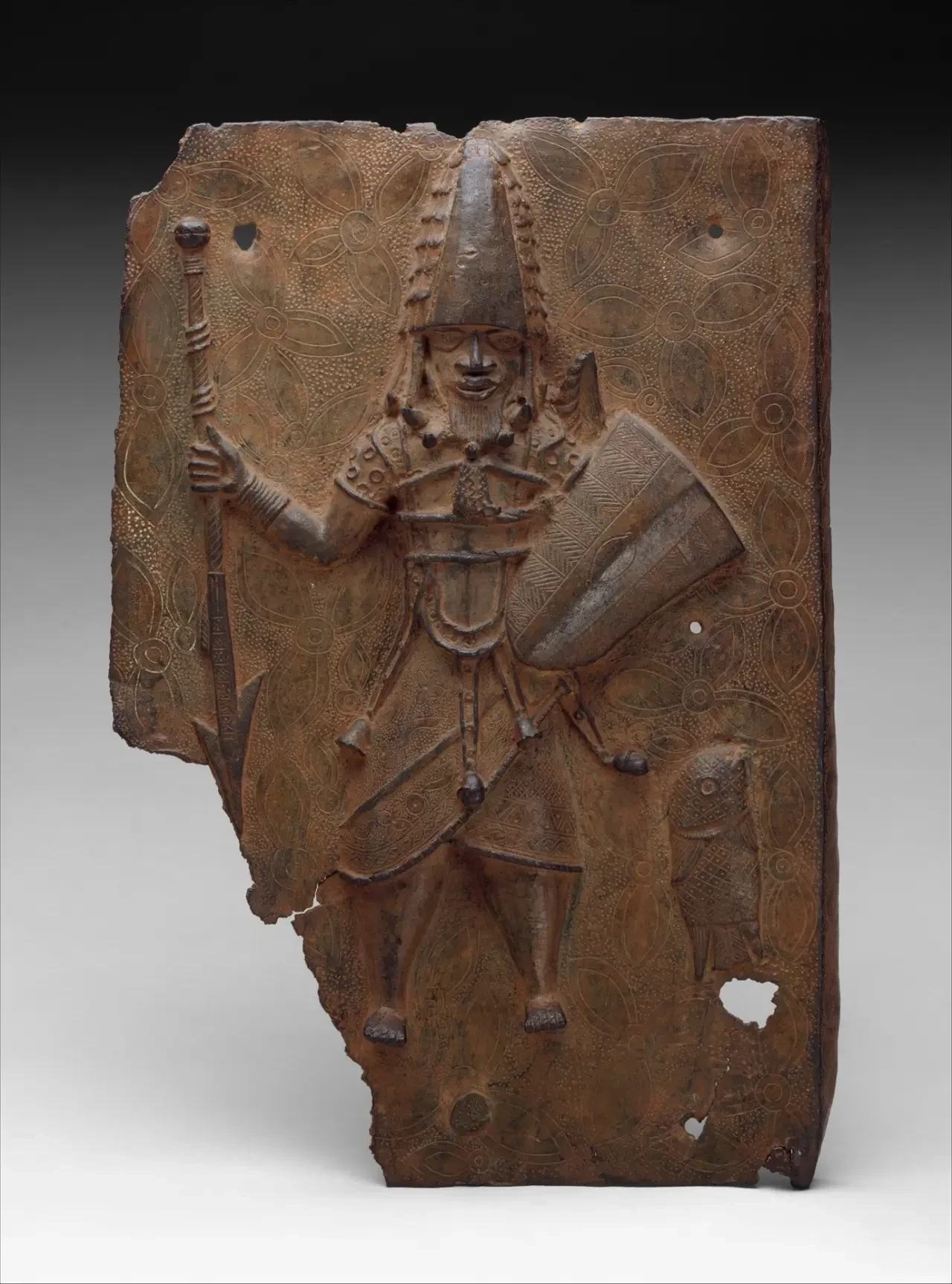 Одна из знаменитых бенинских бронз, попавшая в Метрополитен-музей в Нью-Йорке. Изображает бенинского воина с копьем и щитом…
