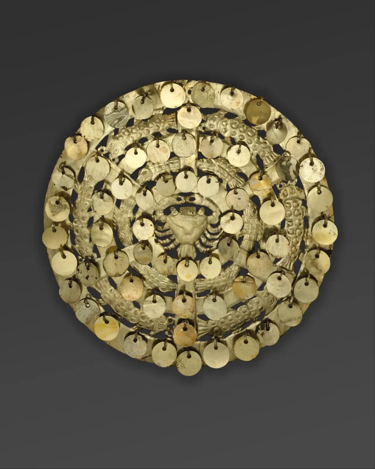 Техническая сложность, необходимая для создания подобных предметов, когда-то позволила ученым назвать этот период эпохой мастеров-ремесленников. Однако технология изготовления этих богато украшенных металлических изделий до сих пор остаётся предметом изучения. Более того, функция дисков, подобных представленному образцу, неясна. Возможно, они служили передней частью щита и прикреплялись к тростниковой основе, но изящность рисунка ограничивала их защитную функцию в реальном бою. Таким образом, эти предметы могли предназначаться для ритуального использования в качестве символических украшений оружия. Кроме того, их могли прикреплять к знаменам или драпировкам. Моче (или мочика) процветали на северном побережье Перу в 200-850 годах н. э., за столетия до возвышения инков. На протяжении примерно шести столетий индейцы моче создавали процветающие региональные центры от долины реки Непенья на юге, возможно, до реки Пьюра на севере, недалеко от современной границы с Эквадором, превращая прибрежные пустыни в плодородные сельскохозяйственные угодья и используя обильные морские ресурсы тихоокеанского течения Гумбольдта. Хотя индейцы моче никогда не образовывали единого централизованного политического образования, их объединяли общие культурные черты.