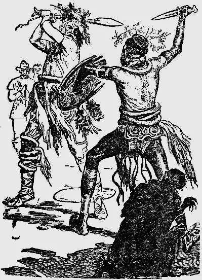 Не говоря ни слова, Конго вышел из лагеря; на левую руку он надел свой громадный щит, в ней же зажал ассегаи — пять штук. В правую взял один — тот, что предназначался для первого удара; его он держал на весу, за середину древка…»