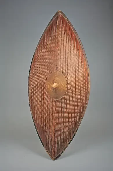 Щит масаев. Наверное, он больше всего подходит на роль щита из романа Р. Хаггарда «Копи царя Соломона». Скотоводы масаи с лугов южной Кении и северной Танзании использовали такие щиты в войне, охоте и обрядах посвящения. Буйволиная шкура, нашитая на деревянный каркас, представляет собой выпуклое эллиптическое полотно, на котором художник начертил богатые полихромные геометрические узоры: два больших полумесяца, симметрично расположенных по обе стороны от центральной вертикальной полосы, состоящей из чередующихся треугольников. Мотивы определяли положение владельца в сложной системе родословной. Многие из этих символических мотивов, называемых сирата, вышли из употребления, и современным масаям уже непонятны. Скорее всего, этот щит принадлежал опытному воину-пастуху. Красные и синие краски, традиционно получаемые путем смешивания различных видов глины и золы, были прерогативой опытных людей. Красная заплата на правой стороне этого щита может быть идентифицирована как сирата эль лангарбвали, знак, который означает большую храбрость в бою. Этот престижный знак присваивается только с разрешения вождя. Диаметр 85,5 см. Метрополитен-музей, Нью-Йорк