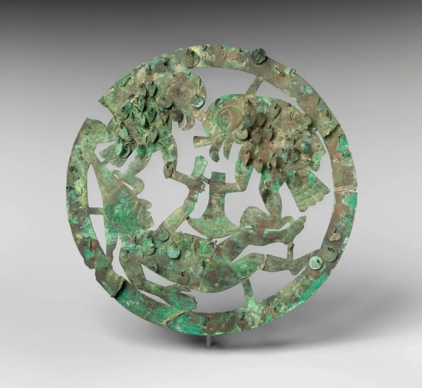 Столь же необычны и оригинальные щиты из Южной Америки, принадлежащие древнему народу моче или мочика. Изделия, выполненные мастерами мочика, также имеются в музее Метрополитен. Вот, например, этот диск из позолоченной меди.