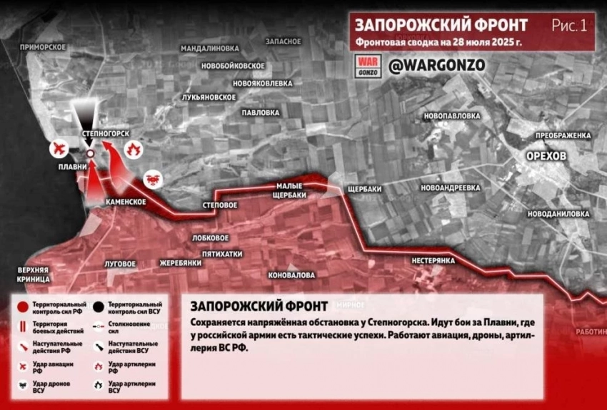 Запорожское направление: сохраняется напряжённая обстановка у Степаногорска. Идут бои за Плавни, где у российской армии есть тактические успехи. Работают авиация, дроны, артиллерия ВС РФ, сообщает Telegram-канал Wargonzo.