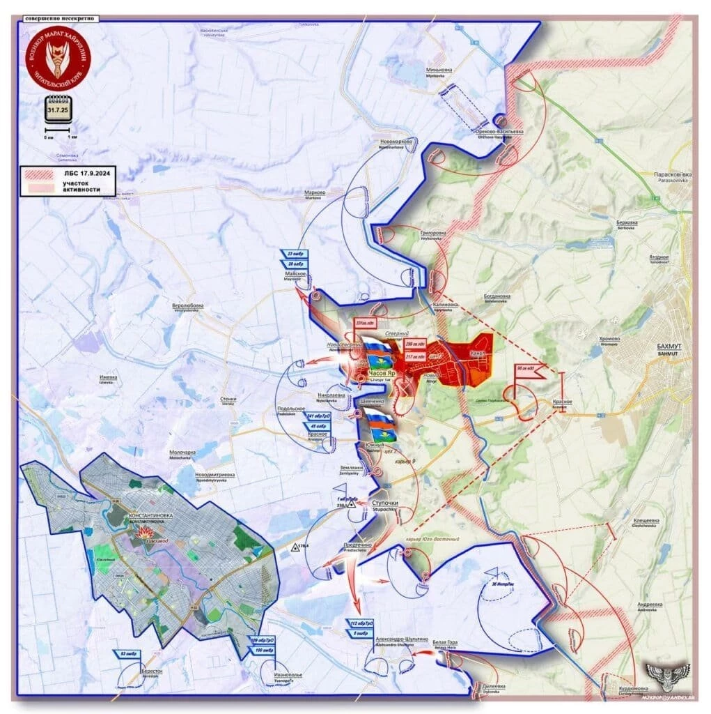 На Константиновском направлении двигаемся на восток от Владимировки и на север от Полтавки. Минобороны подтвердило взятие Александро-Калиново. И это горловина котла с крупными силами ВСУ. Вырваться из ловушки на север не получается — Клебан-Быкское водохранилище блокирует путь. Продолжаем двигаться по направлению к Предтечино. После освобождения Часов Яра русские солдаты начали работу по обходному пути к Краматорску и Славянску через Дружковку.