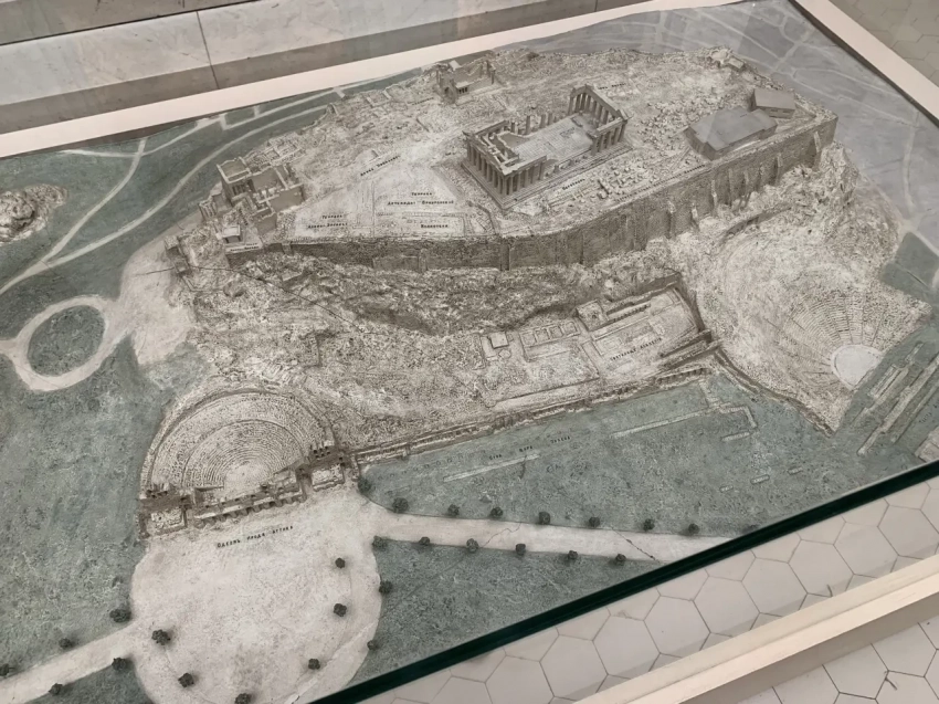 Прекрасно выполненный макет Афинского Акрополя. Реконструкция, гипс. Макет в масштабе 1:425 выполнен в 1900 году скульптором Генрихом Вальгером. Научным консультантом выступил исследователь Акрополя Афин, немецкий археолог Вильгельм Дёрпфельд