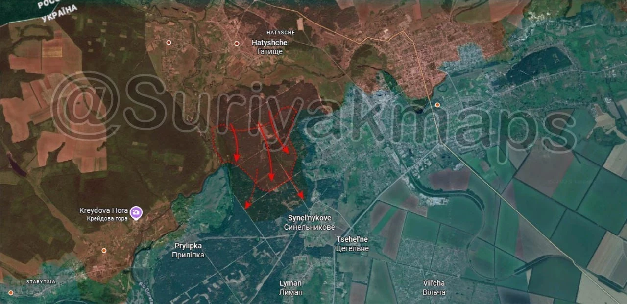 На Купянском участке наши военные продвигаются в районе Лозовой и по направлению к Боровской Андреевке. Идут бои в районе автозаправок «Укравтогаз» и «Татнефть» на северной окраине Купянска. Наших штурмовиков активно поддерживает авиация. Есть успехи и на юге от Кондрашовки. Выше по фронту армия России старается расширить плацдарм на западном берегу Оскола. Для это наши наступают в районе Фиголевки, а также с опорой на Красное Первое - к Нововасильевке, до которой остаётся около 2 км.