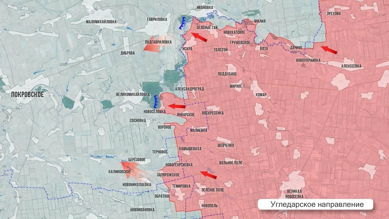 На Покровском фронте, как сообщают, близка к освобождению Муравка. Армия России старается охватить Покровск с нескольких направлений и блокировать трассу логистики ВСУ Е-50. На западном фланге идут бои за Молодецкое и на севере от Удачного, где наши стараются пробиться на территорию обогатительной фабрики. Российские части ведут бои в черте Покровска. На восточном фланге тяжёлое сражение севернее Родинского, однако ВСУ удалось чуть потеснить наши подразделения по линии Никаноровка - Кучеров Яр: часть территорий перешла в «серую зону».