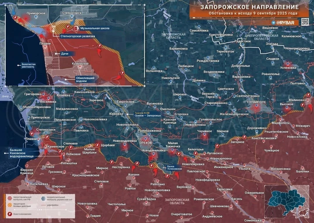 ▪️ На Запорожском участке позиционные бои в районе Приморского и Степногорска. Противник применяет дроны по нашим позициям в Каменском. В районе Новоданиловки и Малой Токмачки без изменений.
