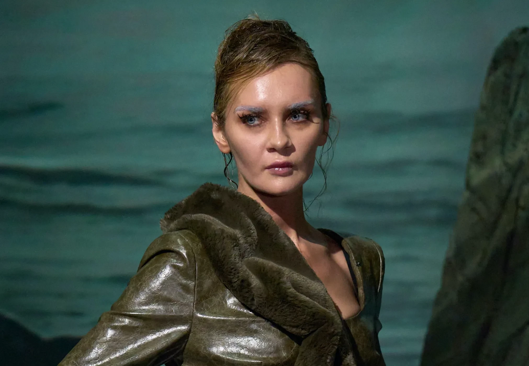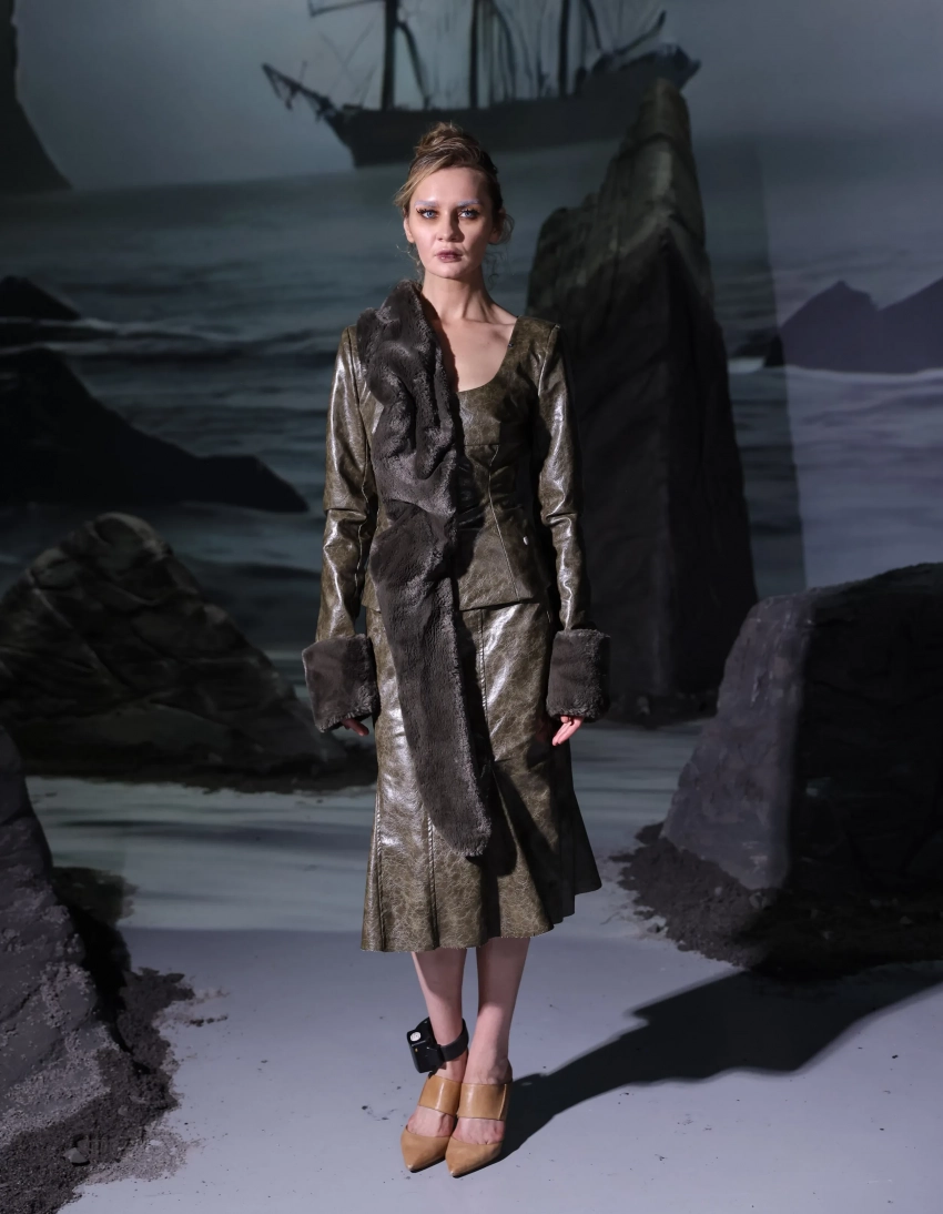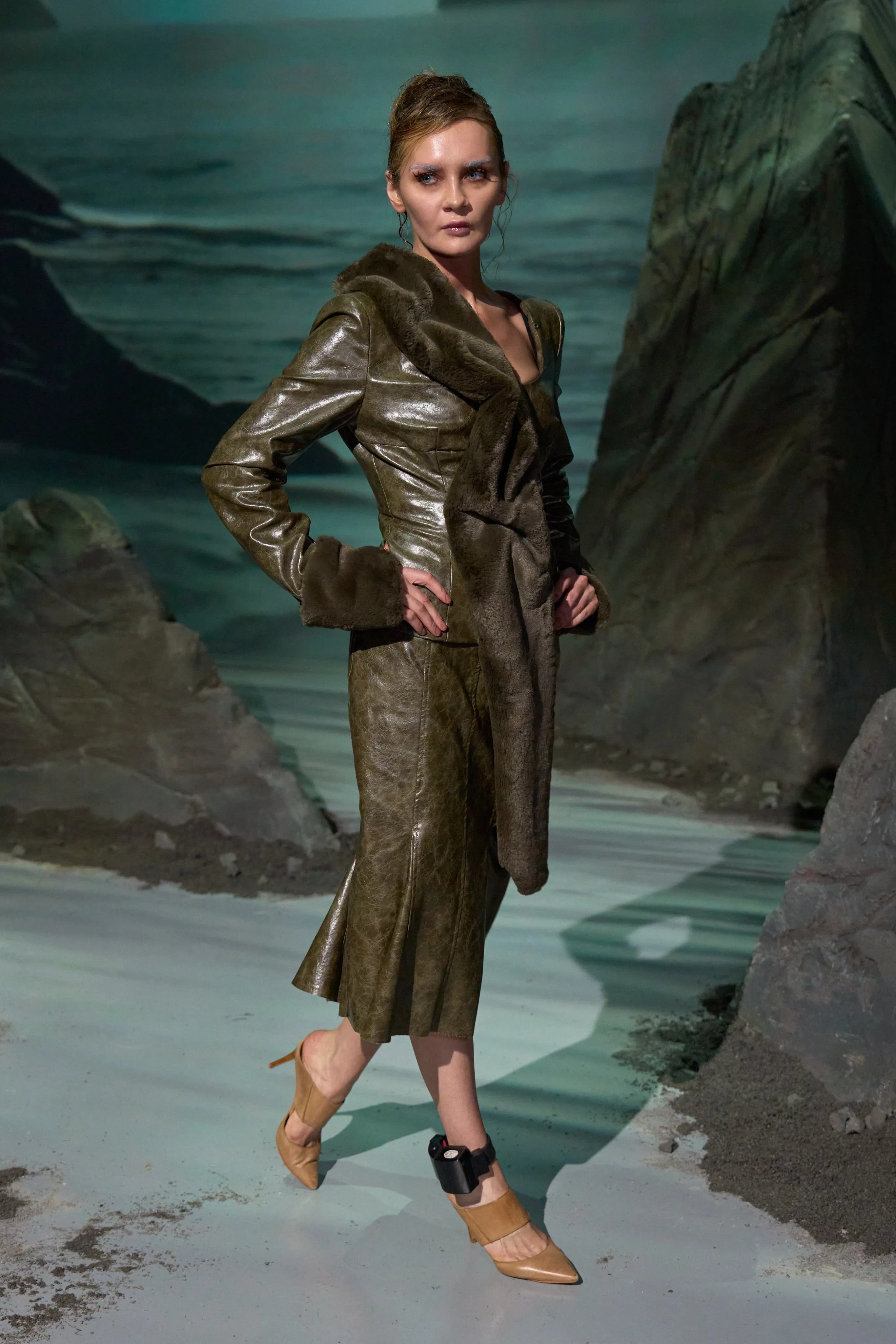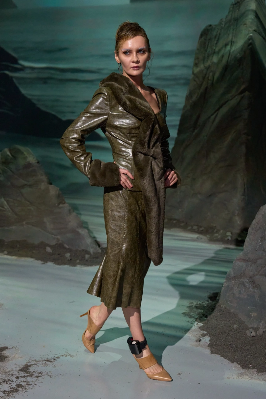34-летняя Анна Делви (Сорокина) открыла показ бренда Elena Velez в рамках Недели моды в Нью-Йорке. Известная мошенница вышла на подиум в зелёном кожаном костюме с отделкой из меха и с электронным браслетом на ноге.