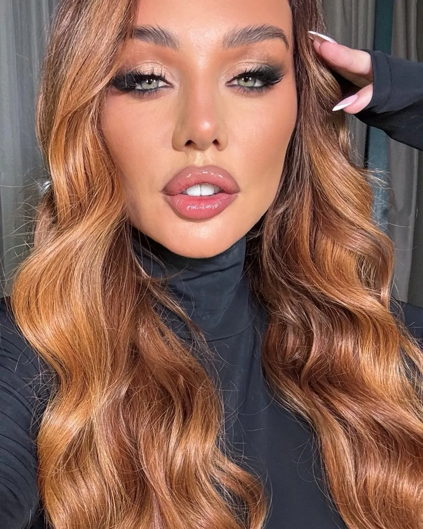 На снимках певица позирует в чёрном джемпере с высоким воротом, дополнив образ ярким макияжем и причёской с кудрями.