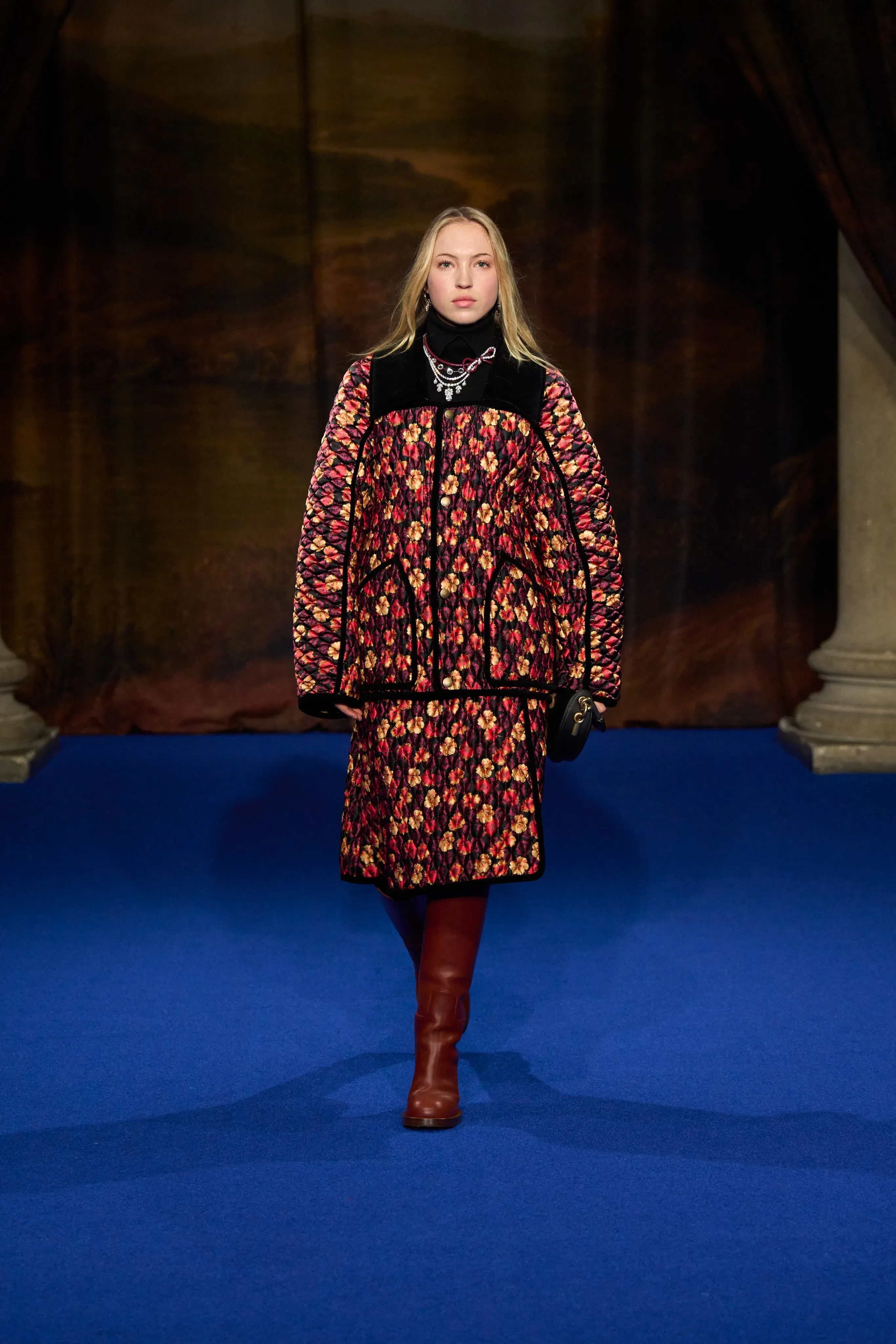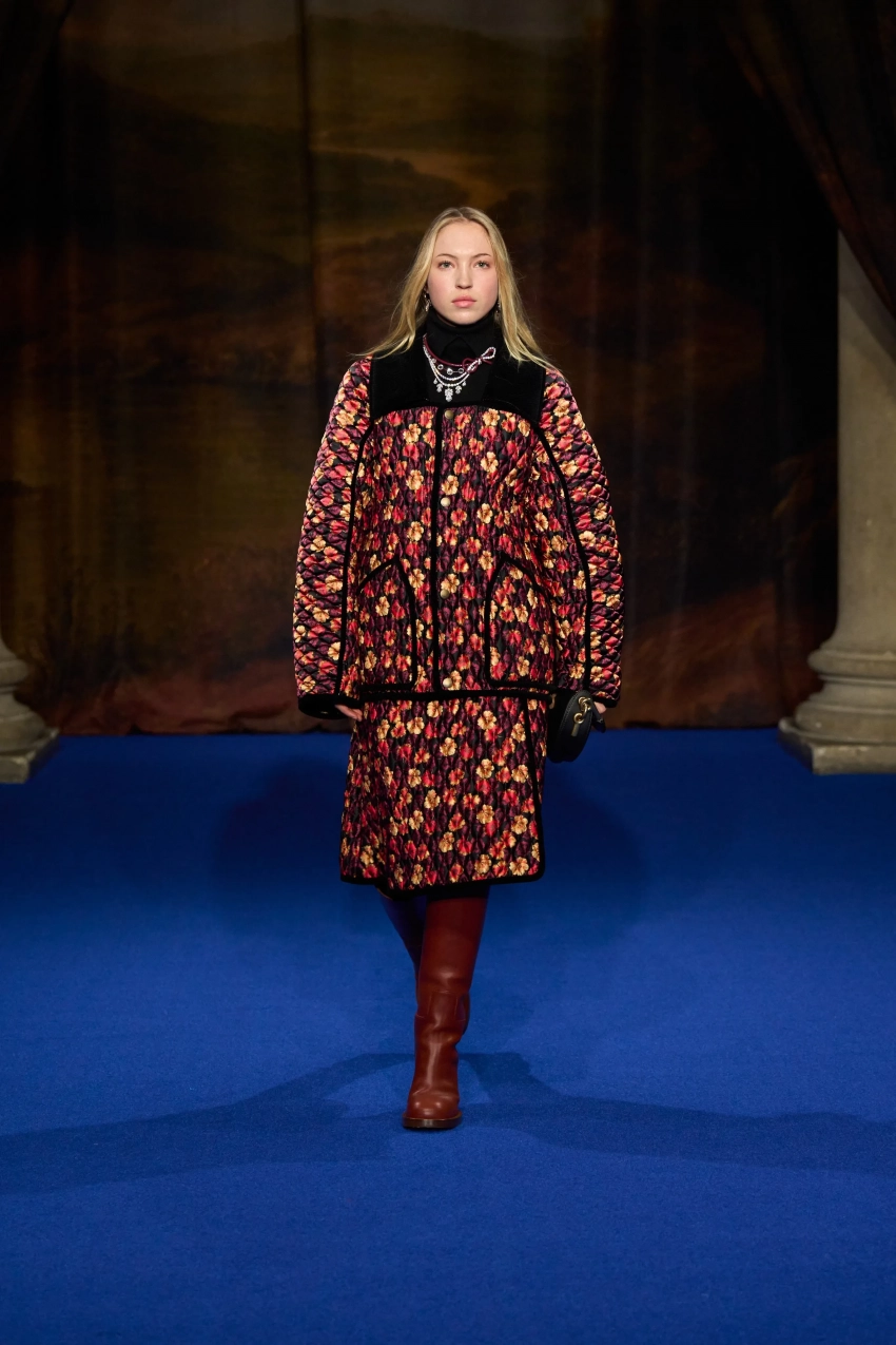 В коллекции преобладали оттенки фиолетового, зелёного, коричневого и чёрного, а также цветочные принты, кожаные плащи, объёмные меховые шарфы, бахрома и сапоги с широким голенищем.