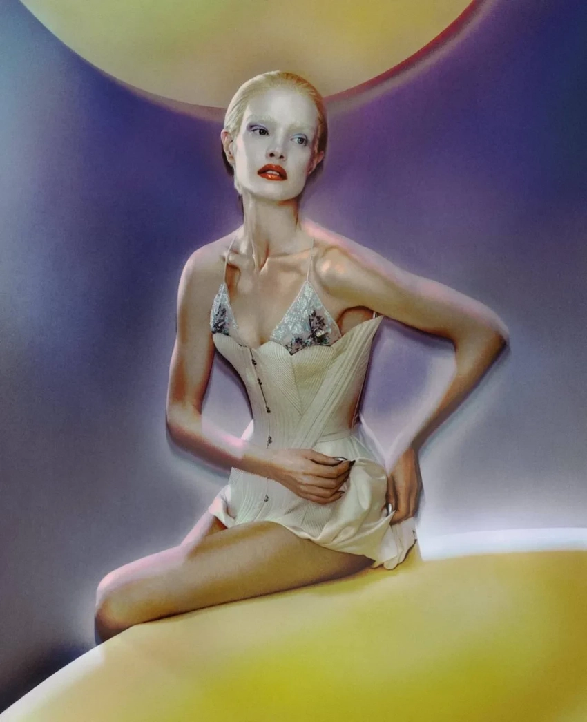 На снимках Наталья предстает в образах, навеянных атмосферой кабаре и ретро-цирка. В объективе Елизаветы Породиной модель позирует в платьях, созданных с использованием ручной вязки и бисера, в атласном кутюрном макси и в мини, напоминающем кольчугу, с жемчужными бусинами. Но главным украшением коллекции стала алая цветочная накидка из сетки, украшенная шифоновыми соцветиями и полностью расшитая жемчугом и кристаллами.