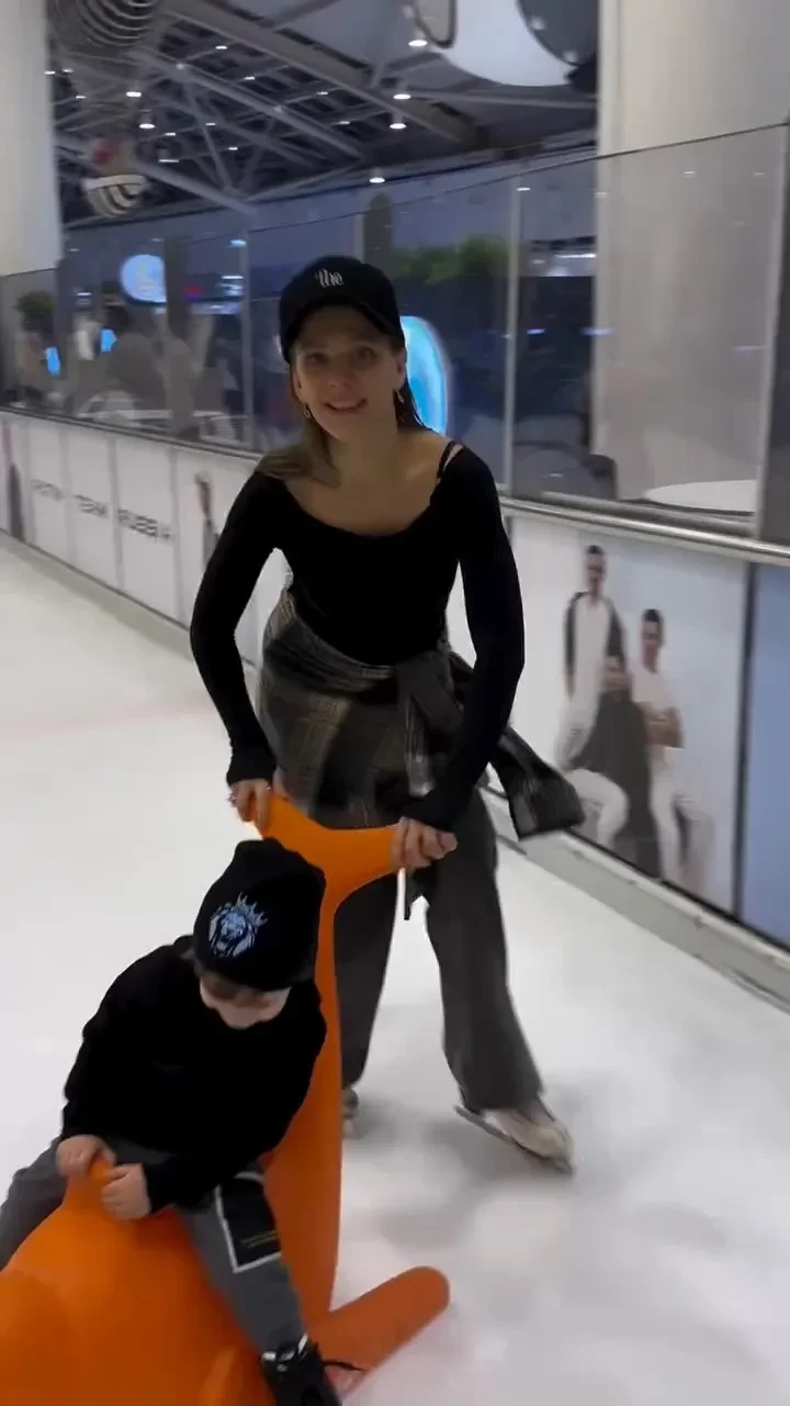 На кадрах она катается с сыном на общественном катке. Мальчик пока использует специальную опору, но иногда уже справляется самостоятельно. Арзамасова поддерживает Льва и комментирует его успехи.