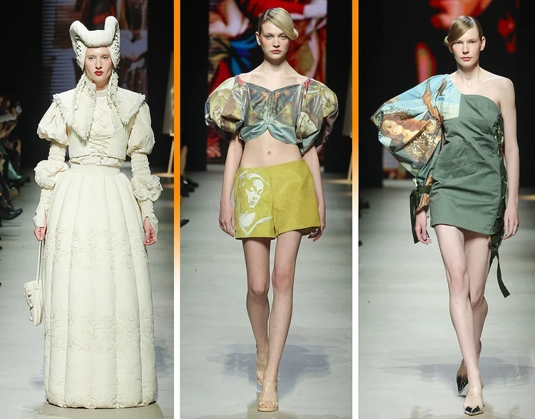 Команда молодых дизайнеров из Sergey Sysoev fashion school превратила подиум в картинную галерею. Модели в пышных платьях с кринолинами неспешно передвигались вдоль холстов с произведениями великих художников, в том числе Леонардо да Винчи и Микеланджело.