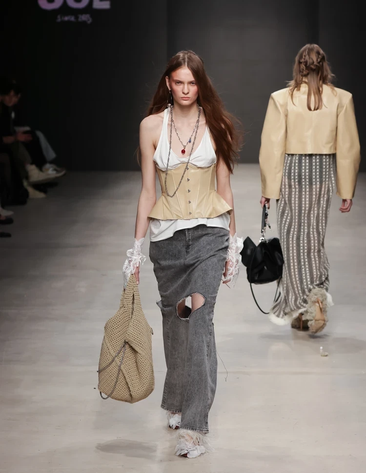 Интересная и воздушная коллекция получилась у основательницы бренда SOL Ольги Селивановой (Москва). Главным материалом Fleur épanouie («Распустившийся цветок») стало кружево, которое украсило платья, юбки и даже обувь. Впрочем, присутствовали образы и с акцентными корсетами, юбками из денима и тренчами из лаковой кожи