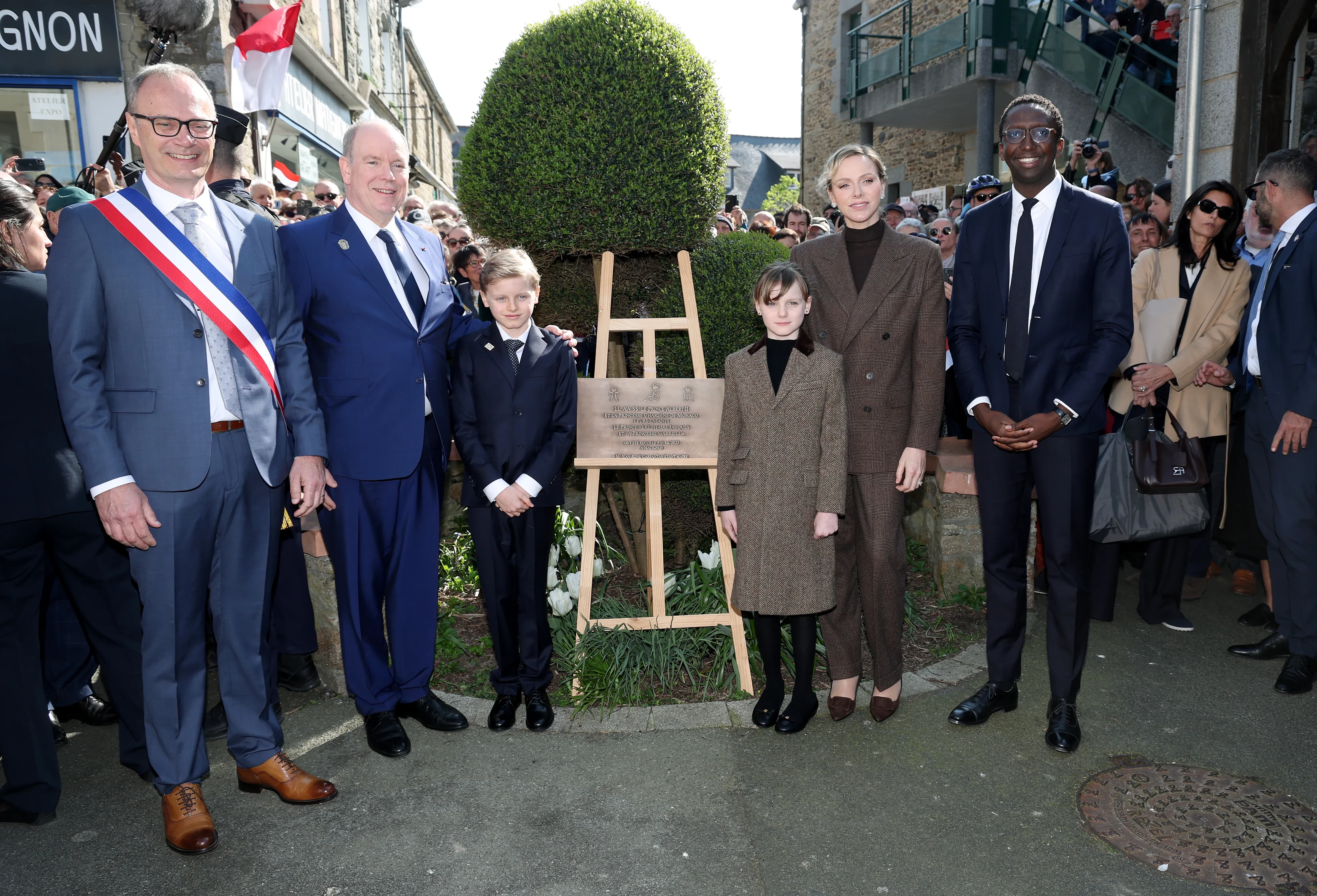 Альбер II и княгиня Шарлен с детьмиСемья приняла участие в открытии мемориальной доски в честь их визита в Матиньон. Напомним, принц Альбер принадлежит к династии Гримальди, которая имеет исторические связи с Бретанью, так как его предки сохранили титулы, связанные с этим регионом.