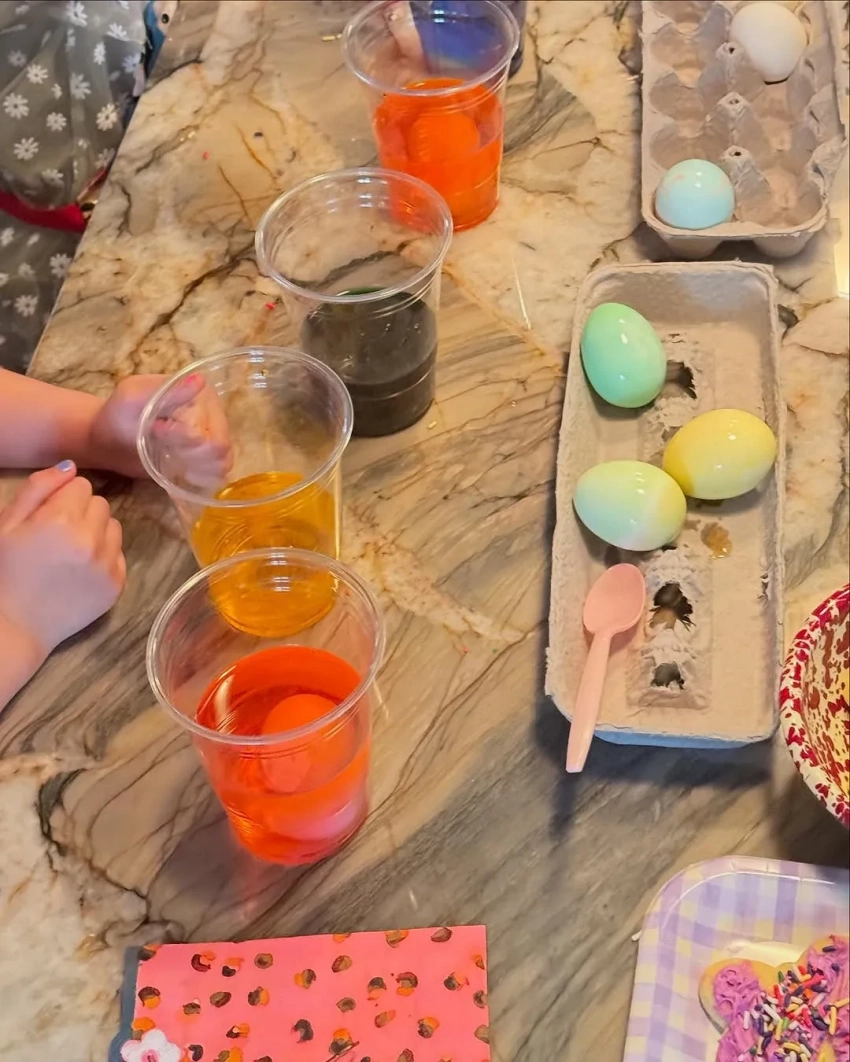 На одном из фото дочь 29-летней том-модели перепрыгивает через лесной ручей, на другом выполняет задание в рабочей тетради. Ещё на одном снимке показан процесс украшения пасхальных яиц.