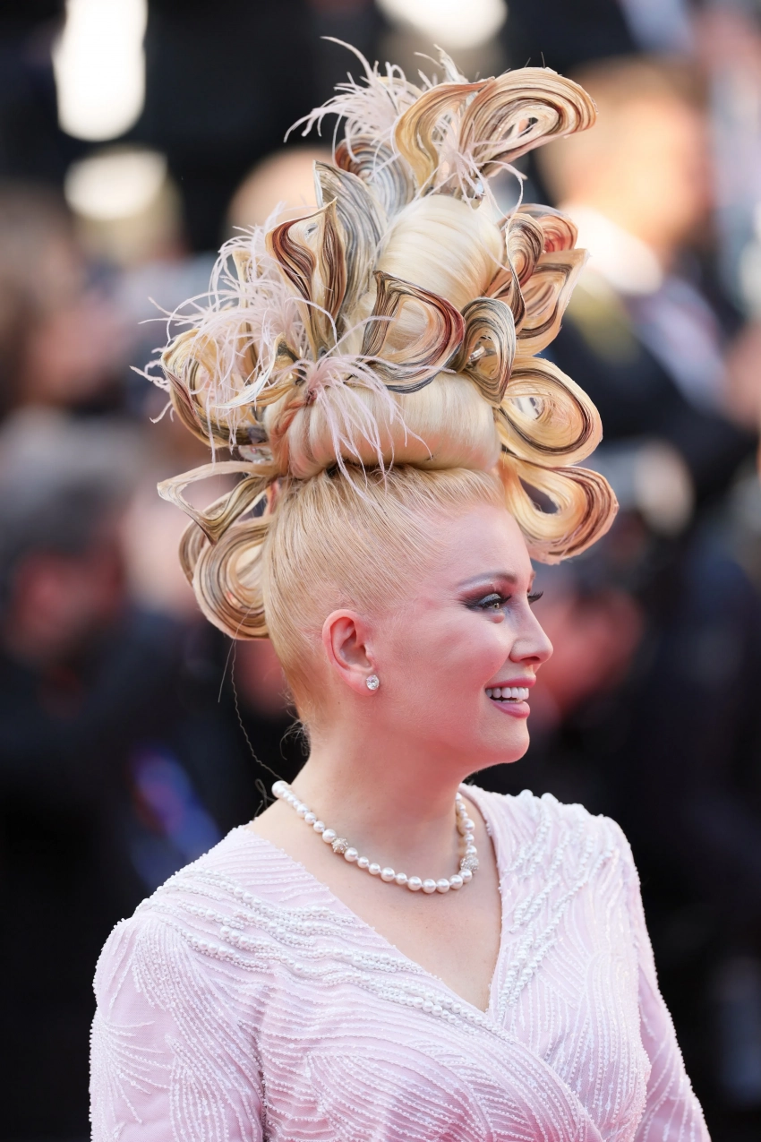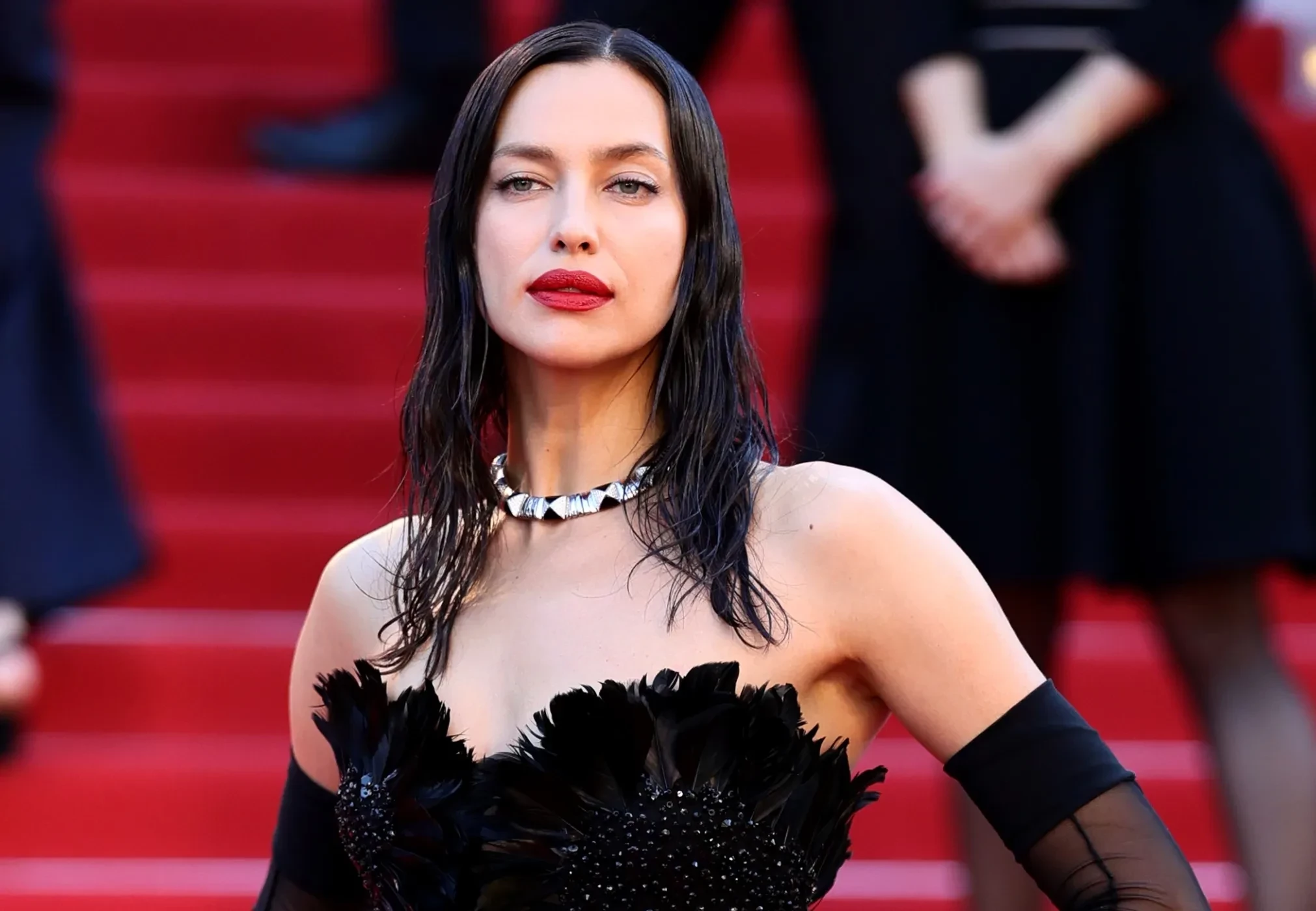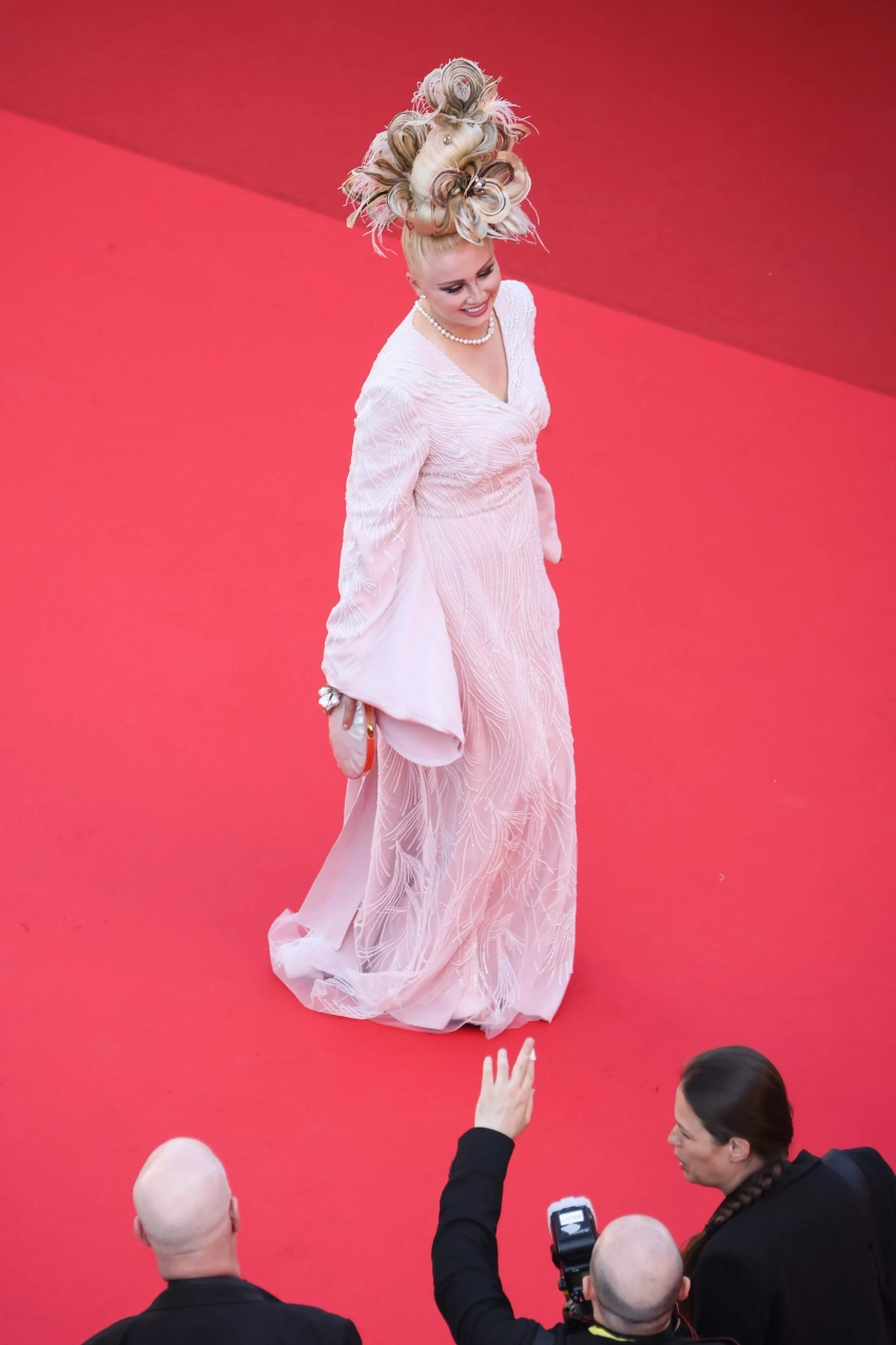 Ирина Шейк появилась на красной дорожке в кастомном чёрном платье с перьями Elie Saab. Лена Ленина, пропустившая церемонию открытия, выбрала для выхода нежно-розовое платье и высокую футуристичную причёску.