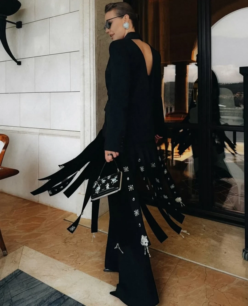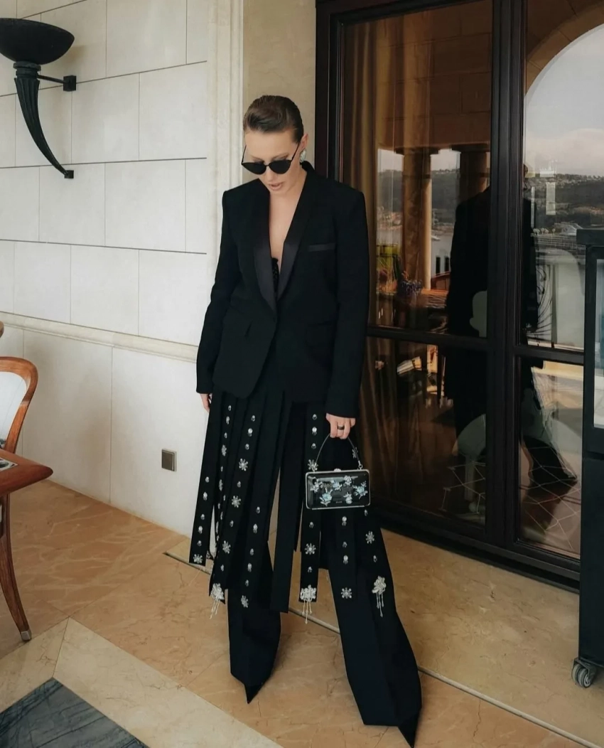 В этот раз на красную дорожку журналистка вышла в костюме LIVY и юбке Prada. Ее образ дополняли серьги Valentino, туфли Ferragamo и сумка Prada.