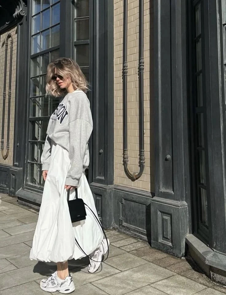 Этот образ показывает: даже в прохладный день можно выглядеть женственно и актуально. Контраст спортивного верха и изящной юбки работает на ура.